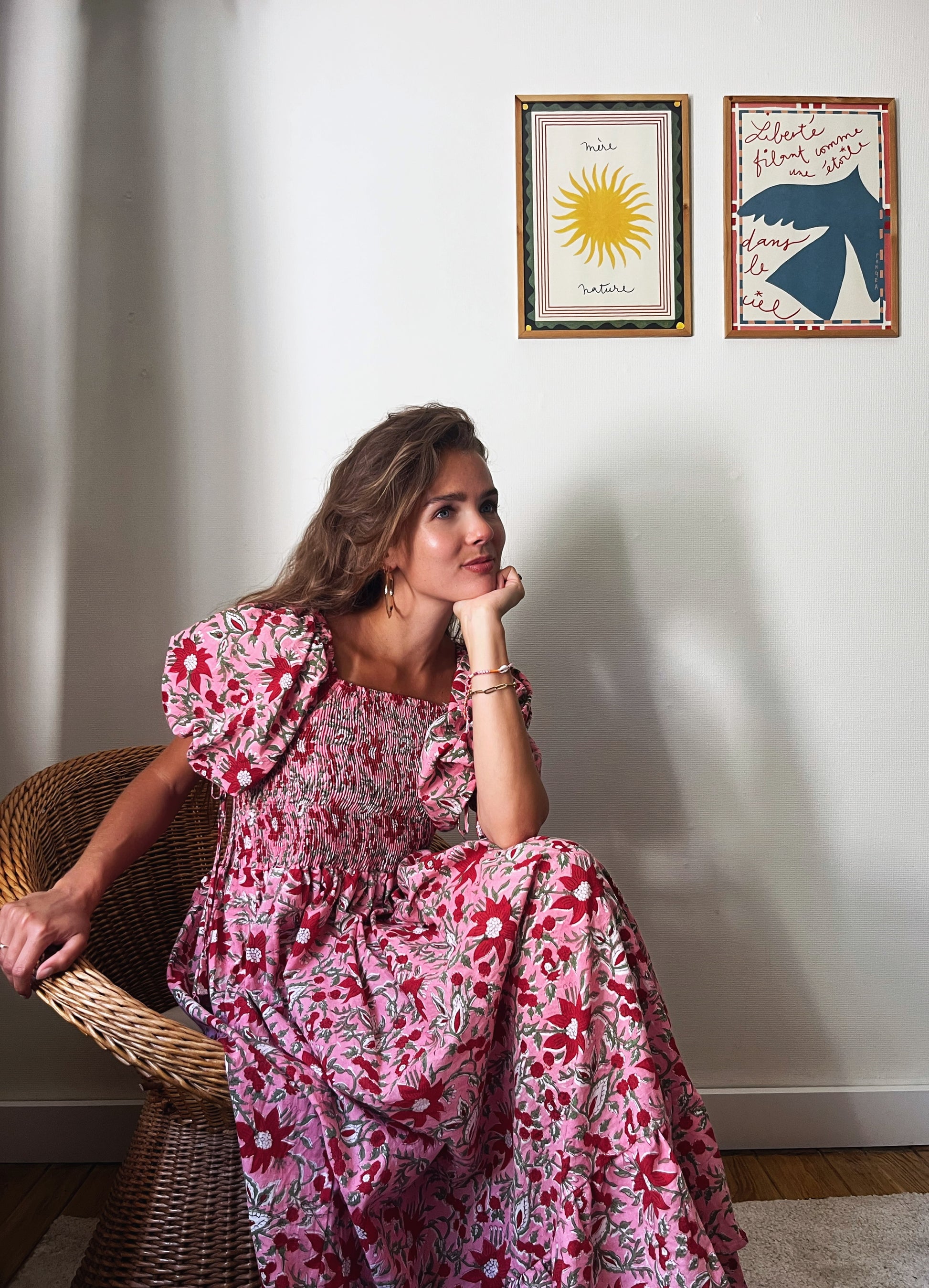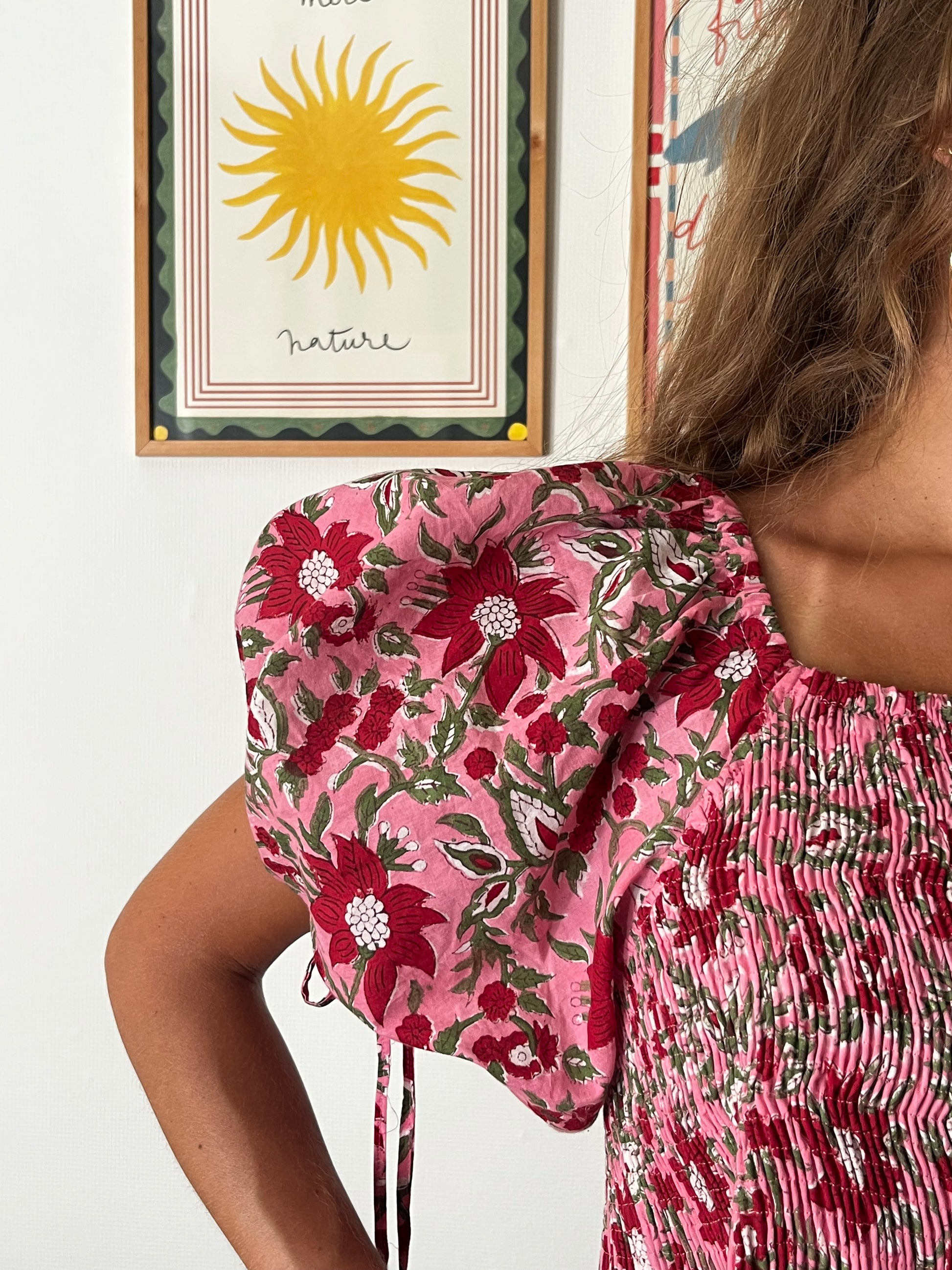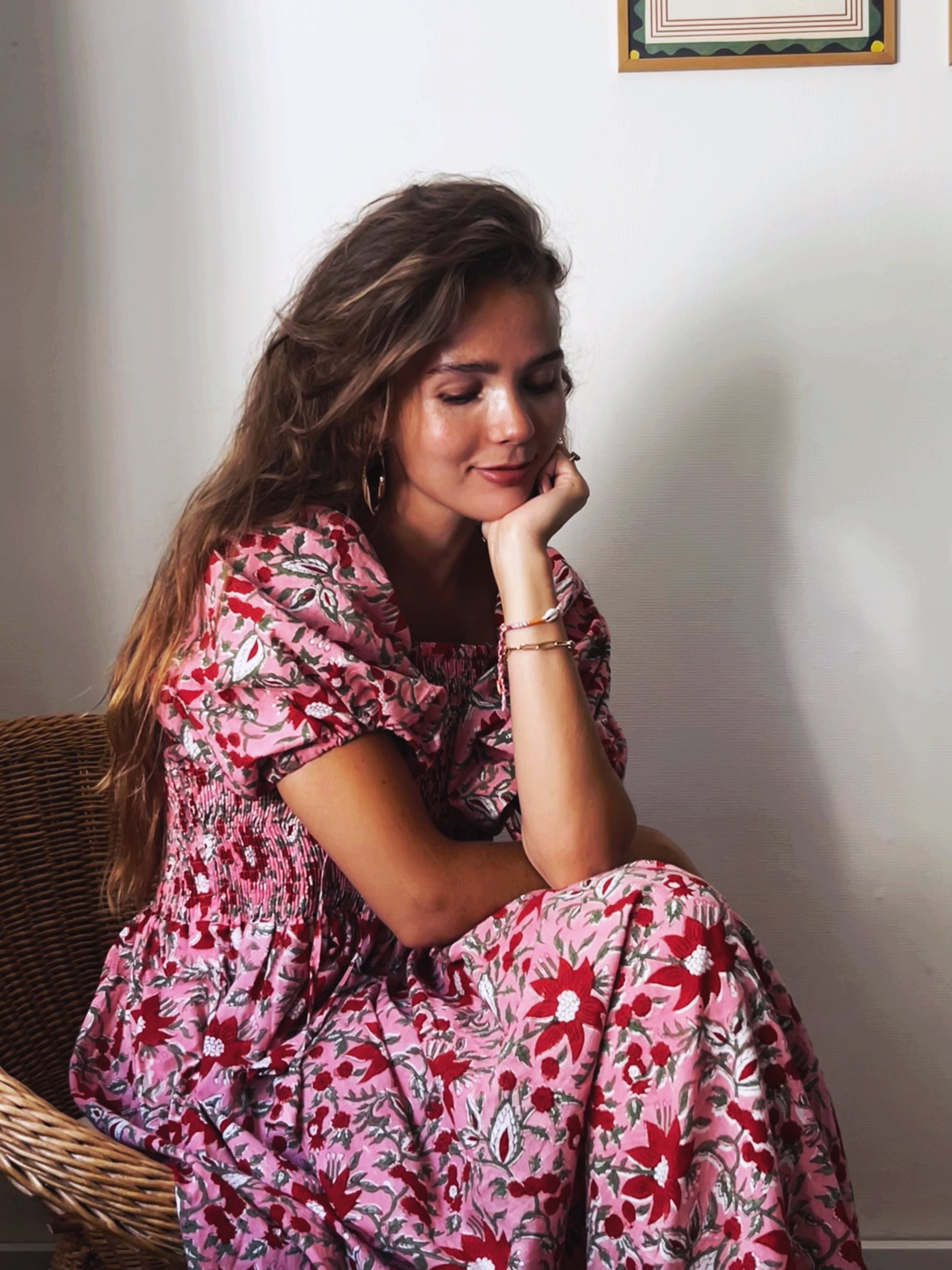 Crafted by artisans in Jaipur using carved wooden blocks and natural dyes, these balloon-shaped dresses offer both comfort and movement. The soft organic cotton makes them perfect for warmer days, while the voluminous silhouette adds a bold yet graceful charm.
