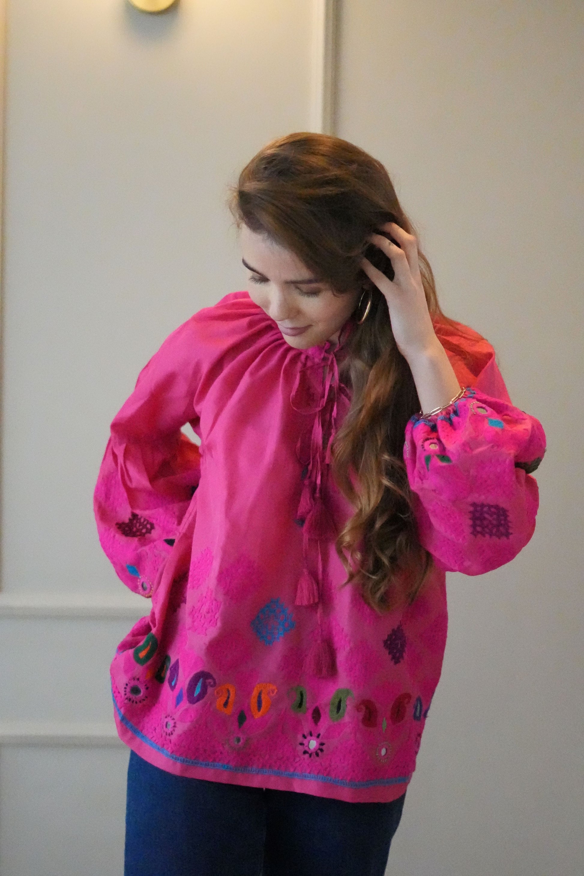 A lightweight blouse handcrafted in India using traditional block-print techniques. Soft cotton or silk, breezy fit, and a print that tells a story.